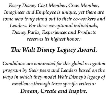 Inspired by Walt Disney’s personal example and lasting legacy of excellence as a dreamer, a creator and an inspiration, The Walt Disney Legacy Award is a global acknowledgement of those who put forth their very best efforts for our Guests, their fellow Employees and the Company.